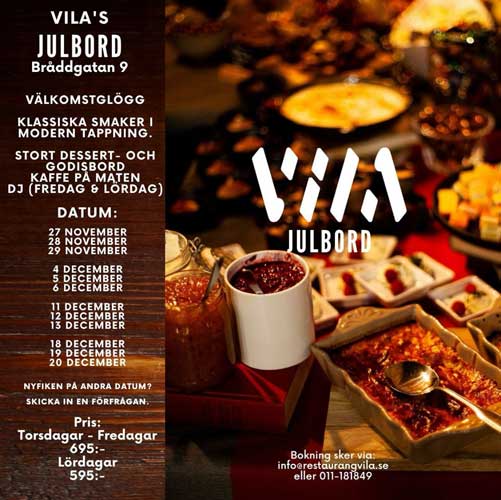 Bokning sker via: 011-181849 eller info@restaurangvila.se