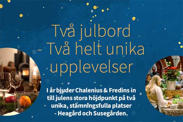 I år bjuder Chalenius & Fredins in till julens stora höjdpunkt på två fantastiska platser. Oavsett om du drömmer om elegans i herrgårdsmiljö eller en rustik jul med skogens vilt, har vi skapat en upplevelse för dig och ditt sällskap.